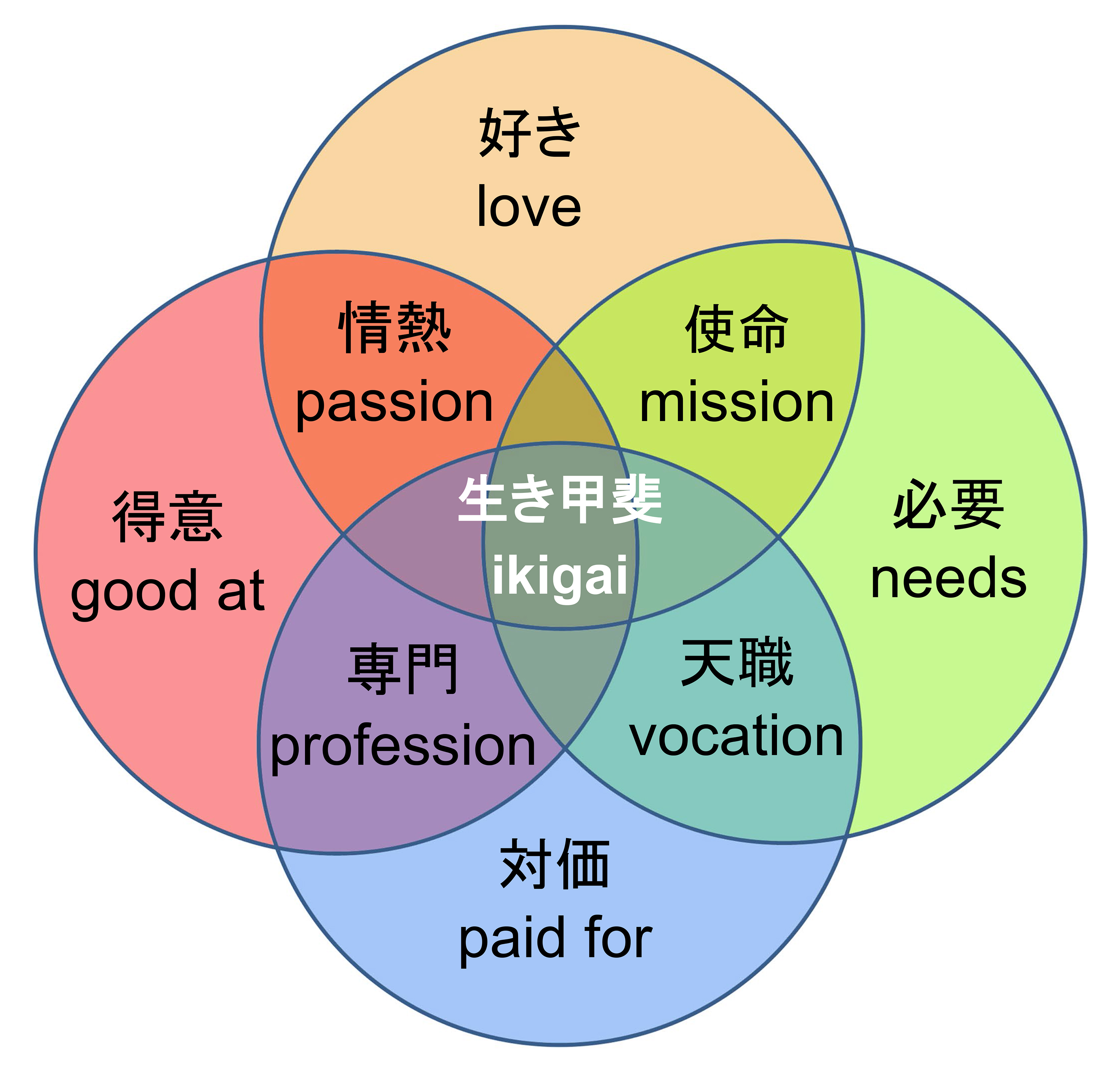 日本よりも、海外で先に「生き甲斐」が注目された。西洋は白か黒か、YesかNoか、良いか悪いかというように二元論の考え方が多い。一方、東洋では直線ではなく平面や二次元で表現されたりする。右図のように、ikigaiについて、多面的にまとめられている。外側の4つは、好きなこと、必要なもの、お金を費やすもの、得意なもの。そして、その内側には、使命、天職、職業、情熱が位置している。