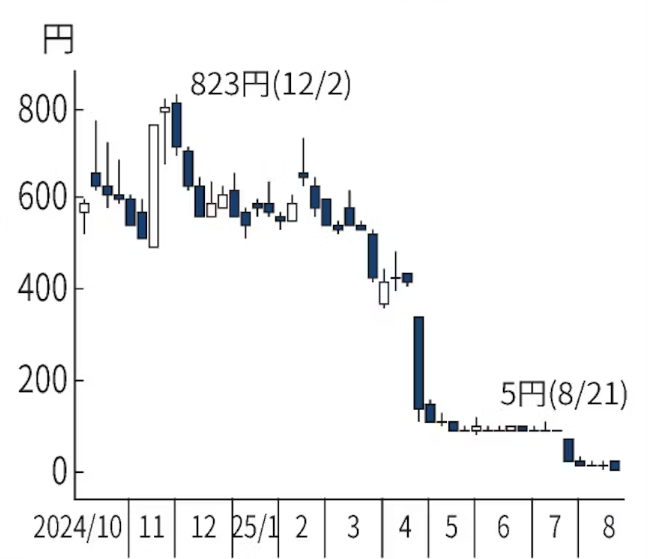 次図は、ある企業の株価推移です。昨年10月に上場され、今年8月31日に上場廃止に至ったということです。24年10月上場時の公開価格(540円)、公開時価総額(180億円)取引最終日の終値は5円、時価総額は1億8100万円。つまり、公開時より資産価値が100分の1になってしまったということです。当社の社名は(株)オルツ。連日、不正会計、循環取引による売上高架空計上、民事再生法などの話題がジャーナリズム界隈で持ち切りの会社です。