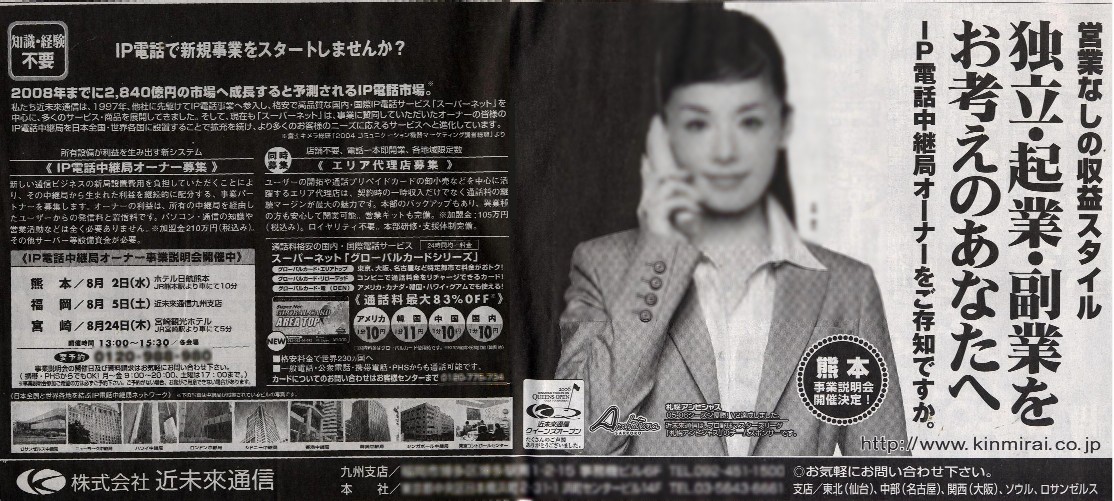 約20年程度前のことです。日本経済新聞、朝日新聞、毎日新聞などのメジャー誌に、次図のような広告が繰り返し、掲載されていました。テレビ放映は見ておりません。その頃は、このコラムの前身の「徳島エコノミージャーナル」への連載を開始してから5年程度の経過時点でした。iPhoneが普及し始める直前の頃でした。