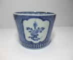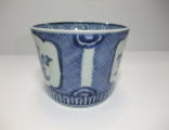 | No.10040102 \60,000(1客) 染付南蛮人文八角猪口。 寛政頃。 八面に南蛮人と芭蕉文を交互に描いた八角面取りの可愛い猪口です。このタイプの猪口にしては少し小振りになります。見込みに油壺が描かれていて意味合いは分かりませんが珍しいです。人物を白抜きにしている所もポイントですね。若干のひっつきがありますが、問題ない範囲です。2客の画像[横1・横2・上から・裏画像(見本画像とは別の一客)]を掲載しましたので、ご覧ください。 傷なし2客あります。 8.9cmW×6.0cmH |