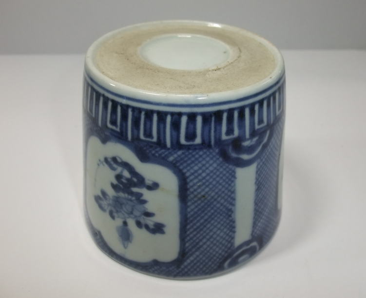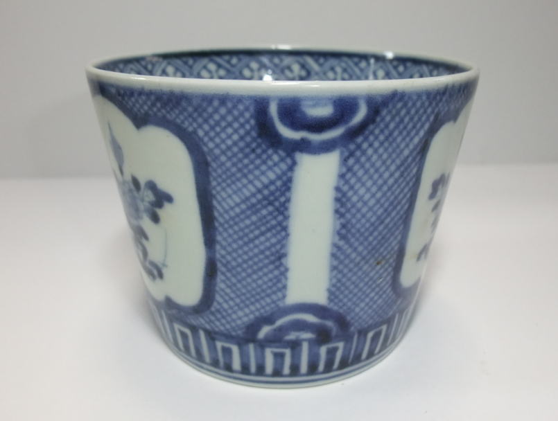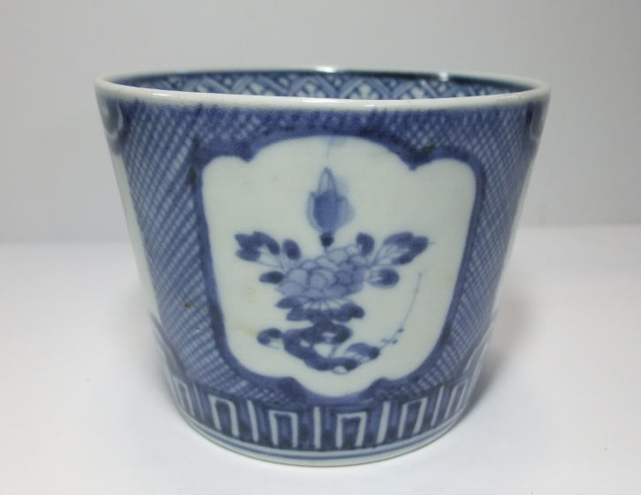 | No.25102002 \20,000(1客:傷なし) \19,000(1客:高台ホツ) 染付草花文大蕎麦猪口。 宝暦。 蕎麦猪口としては大振りの堂々とした作品です。下地に薄ダミを使用して線書きで細かく格子を描き、3方の窓枠を大きくとって牡丹文を描いています。薄手に成形された宝暦期作品としては最上手作品の蕎麦猪口と言えるでしょう。染付の滲みも殆どなく良い状態です。1客高台にホツがあります。 傷なし 10.0cmW×7.6cmH 傷なし5客売約済 |