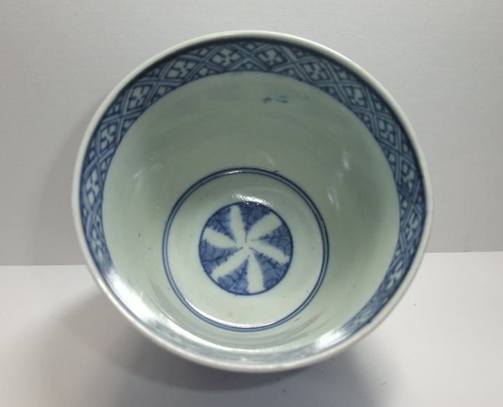 | No.2061002 \ 23,000(1客) \105,000(5客セット) 染付ヨーラク文猪口。宝歴〜明和ころ。 見込みに五弁花、外と内側にヨーラク模様を書き込んでいます。少々にじみもありますが、全体的に良好です。 傷無し。5客あります。 8.6cmW×6.0cmH |