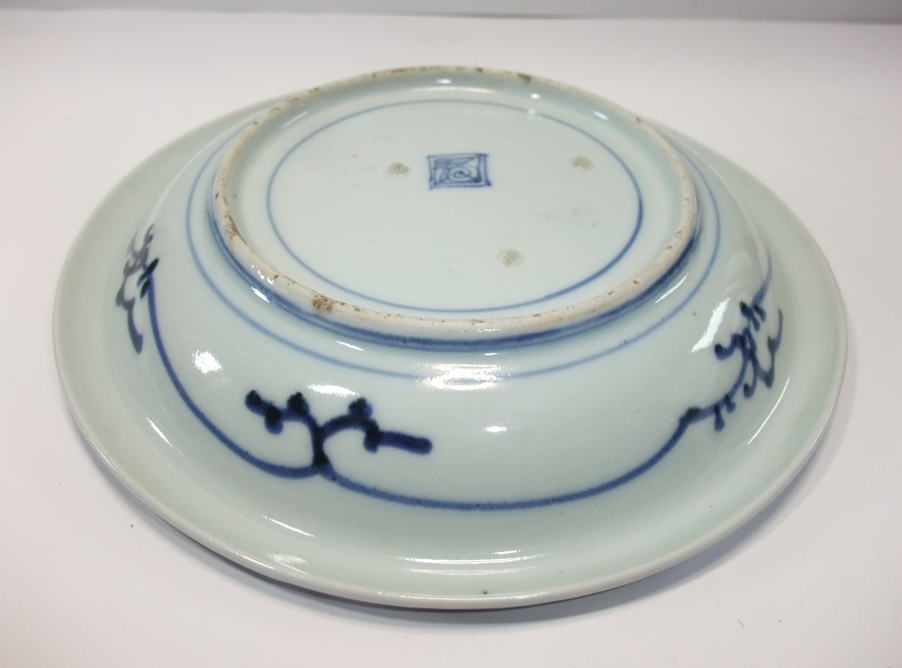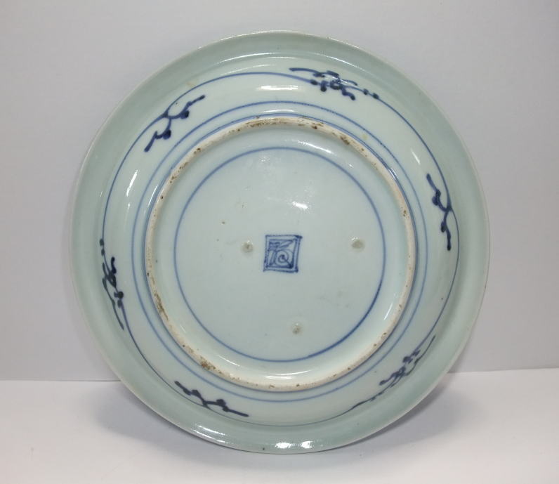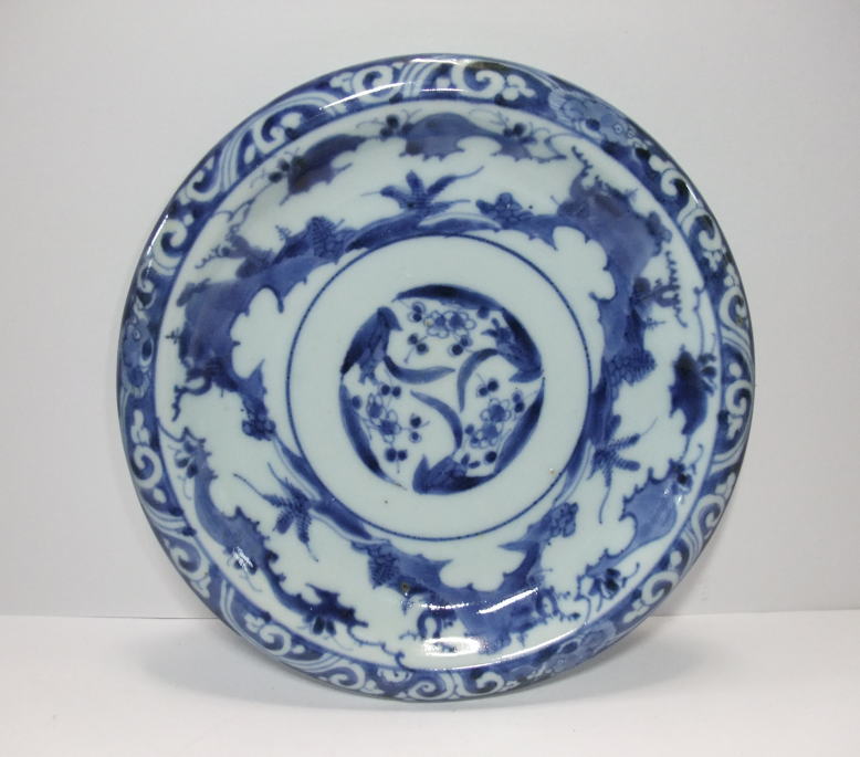 No.8111003 \ 25,000(1客) 染付牡丹ニ松梅文中皿。 享保。 見込み五弁花に縁周りを8面に区切って牡丹、松梅文を描いています。享保期古伊万里の教科書的な中皿です。寸法も大きめで7寸前後のお皿を欲しい方には最適だと思います。お料理も盛り付け易いですね。 傷なし4客あります。 20.4cmW×3.1cmH |
