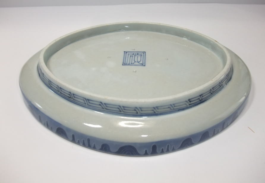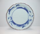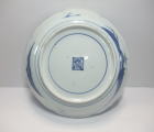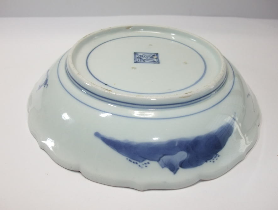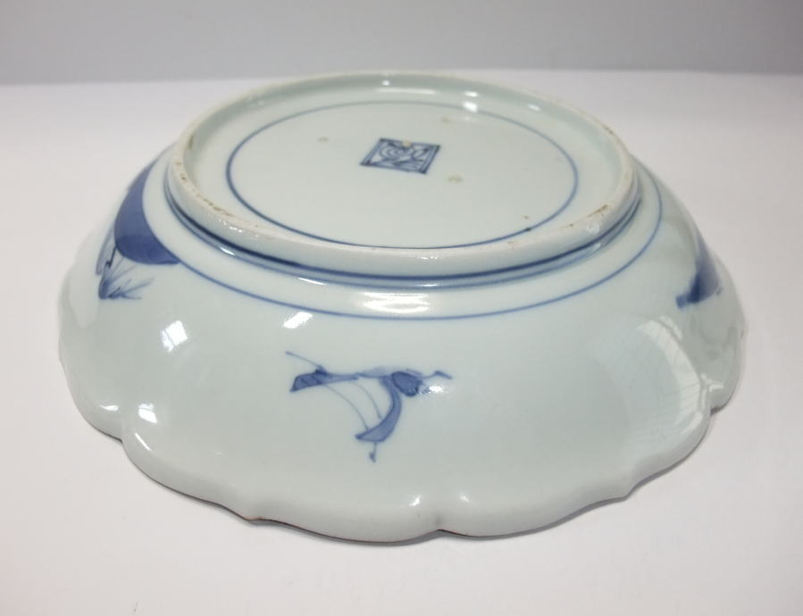 No.25111005 \120,000(1客) 藍九谷双鷺文中皿。 寛文。 寛文期藍九谷様式の作品です。全体に白磁部分を強調して見込み右隅に双鷺文、バックに水葵文を大きく描いています、。裏は染付のラインのみにして寛文期頃独特の裏銘でまとめています。見込みを染付で全体のイメージを白磁を強調して縁に陽刻で文様を表現している手法は当時最も流行った表現方法だったようです。 傷なし1客あります。 21.5cmW×3.1cmH |