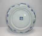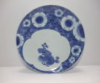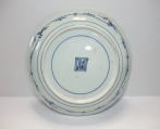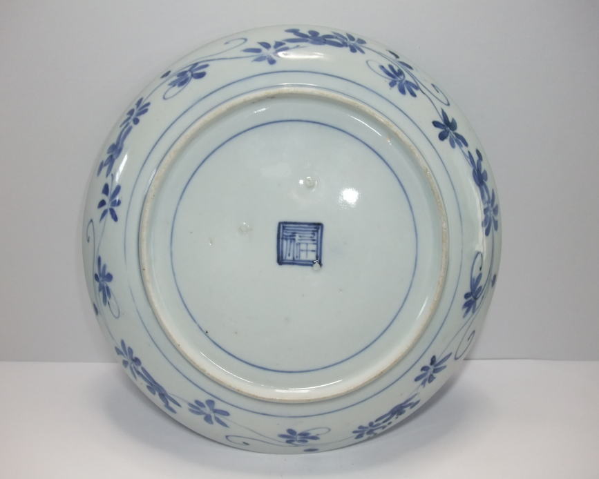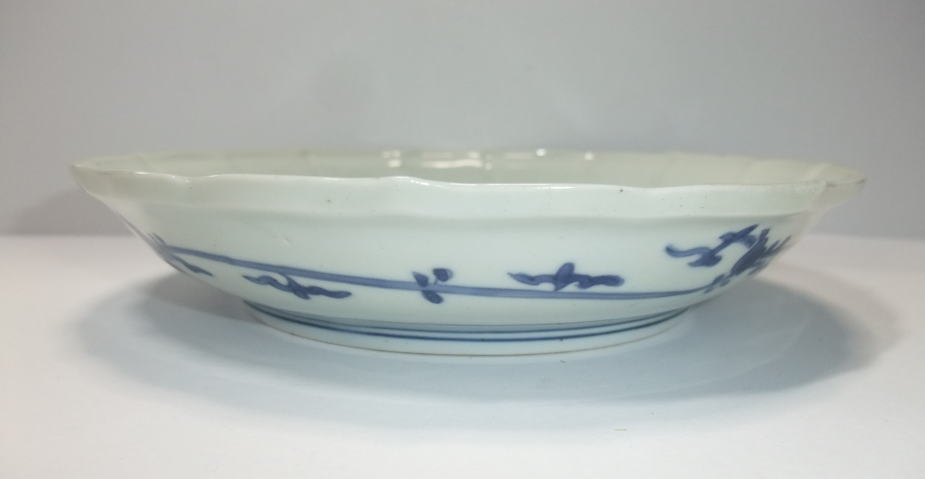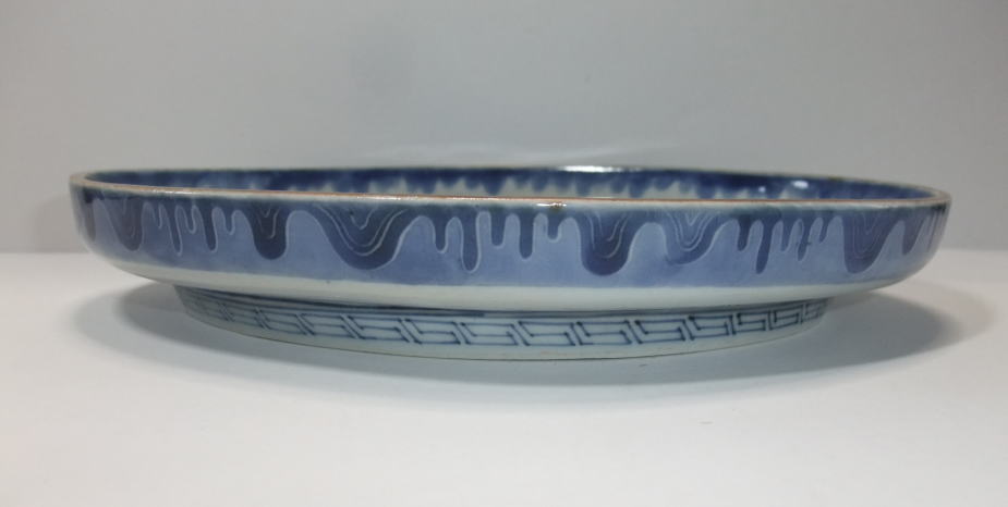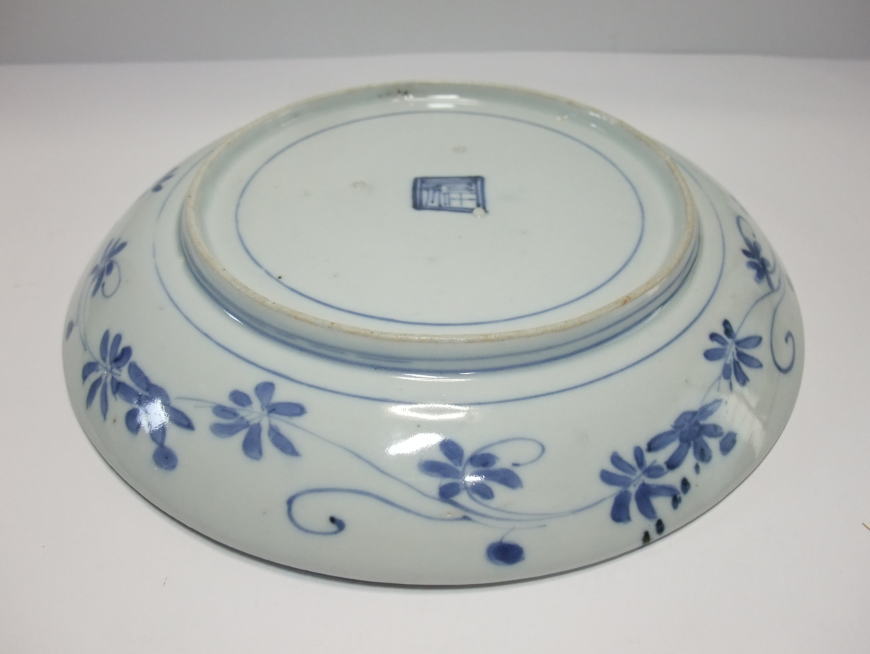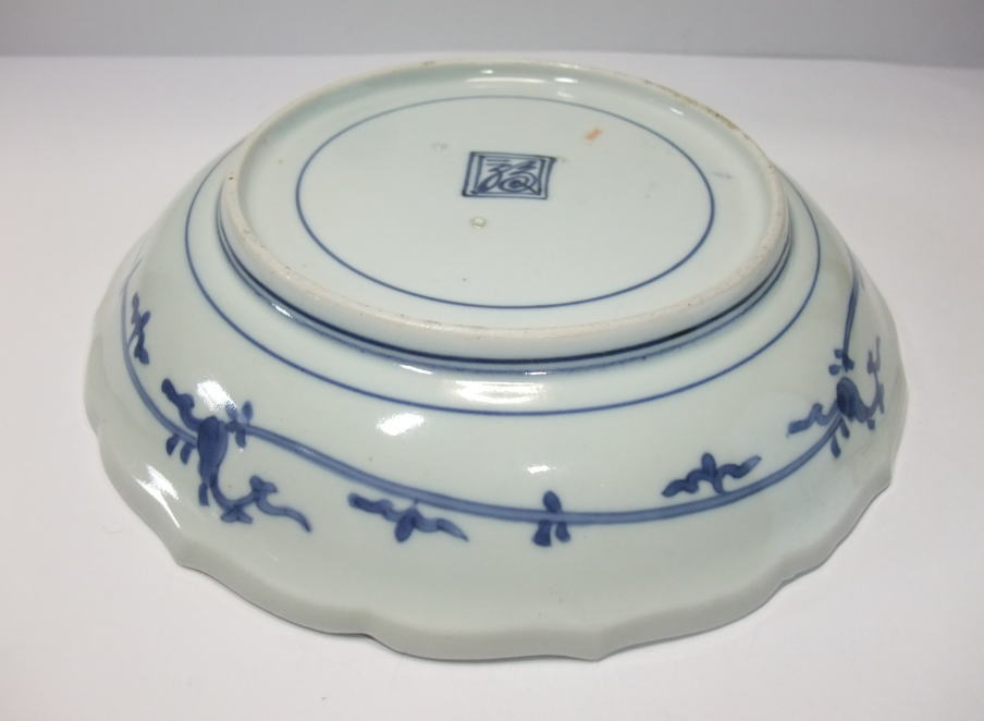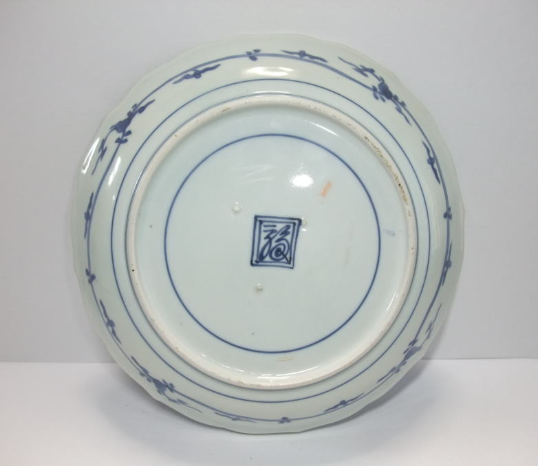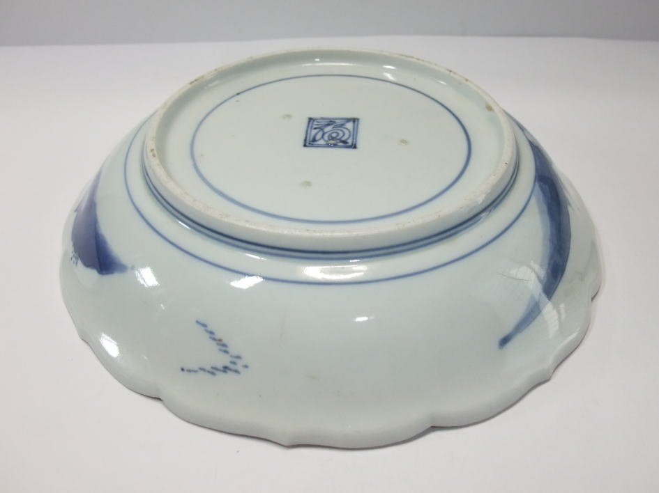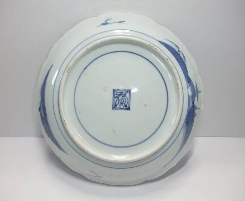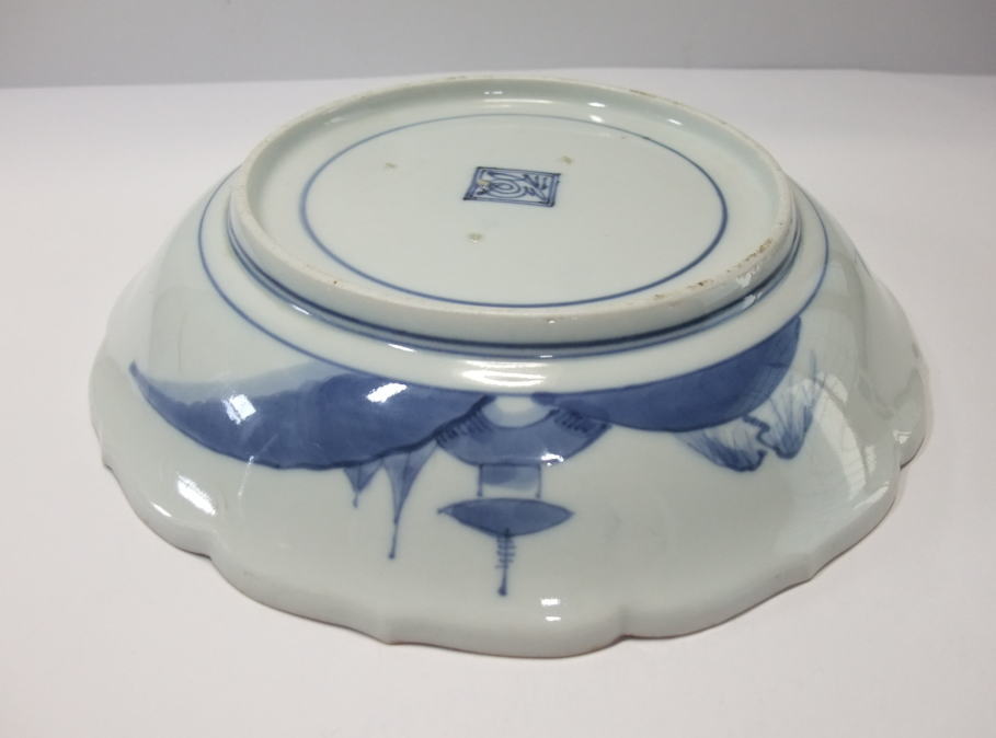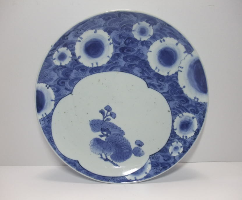 | No.25112002 \120,000(1客) 藍九谷菊花雪輪文中皿。 寛文〜延宝。 寛文期〜延宝期にかけて制作された作品になります。下地にダミを使用して流水文、白抜きで大きく雪輪文を描き、左下に大胆に木瓜形の窓枠を作って菊花文を描いています。裏文様の唐草文様も独特の唐草でシッカリ描かれ角福銘でまとめています。白磁部分に若干の灰降り跡がありますが鑑賞には問題ない範囲です。飾ってお洒落な作品です。 傷なし1客あります。 21.3cmW×3.2cmH |