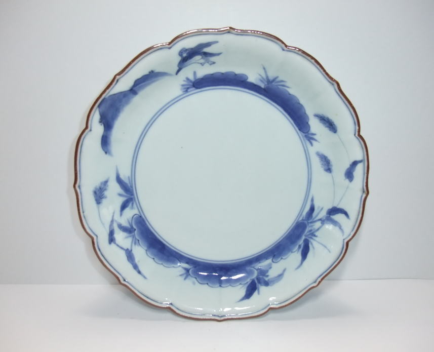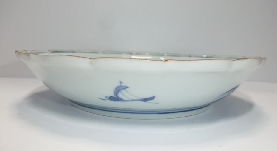No.25112001 \45,000(1客) 藍柿風景鳥文6寸深皿。 元禄。 元禄期藍柿衛門様式の作品です。見込みを余白にして縁廻りに草花をメインにした風景文に鳥を1羽描いて見た目に変化を持たせています。縁の鉄釉薬も白磁を押し出して図柄をシンプル描いた見た目を引き締める効果が抜群です。裏文様も風景文に帆掛け船を描き変化を持たせています。生地白く、染付の色合いも綺麗に発色した上手作品です。 傷なし1客あります。 18.8cmW×3.8cmH |