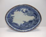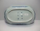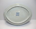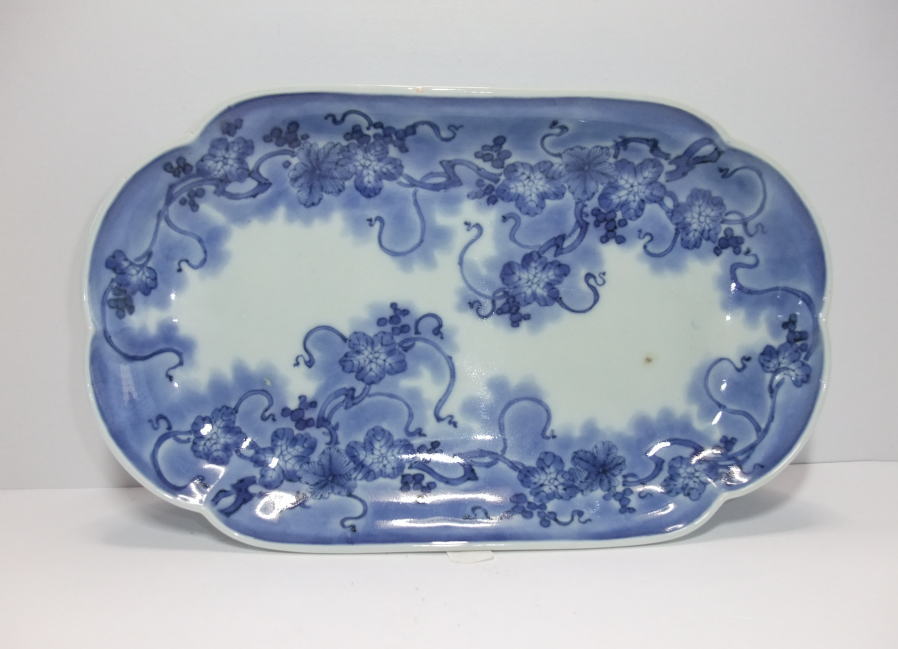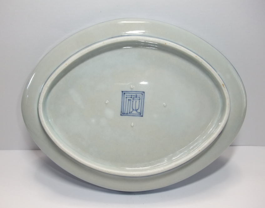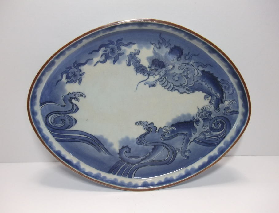 No.25112003 \170,000(1客) 藍柿雲龍文楕円形中皿。 元禄。 元禄期藍柿衛門様式の名品です。型押しで成形され縁が立ち上がった器形で雲龍文を豪快に描いています。縁外の雨垂れ文にも目が惹かれます。全体に特に裏に薄く煙が入った状態ですが染付の色合いは問題ない範囲です。飾って問題ない範囲で作品その物の魅力が勝っている作品です。裏銘は柿銘の古人。 傷なし1客あります。 23.4cmW×17.9cmL×3.3cmH |