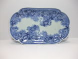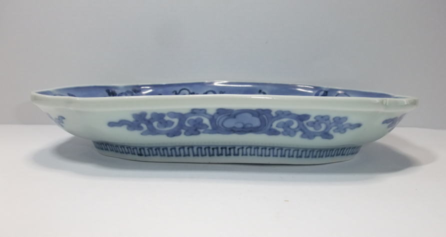 藍九谷水仙梅文中皿。 明暦〜寛文。 明暦期から寛文期に制作された藍九谷様式の中皿です。ダミを左縁を白磁に残しハートに近い窓枠を少しずらして配置して上下、右縁をダミにして窓枠内の白磁部分に染付で水仙に梅文を描いています。見た感じのイメージが斬新な図柄で江戸時代前期の構図である事が信じられない気分になります。寸法もシッカリあって飾り映えする一品です。 傷なし1客あります。 21.0cmW×3.2cmH |