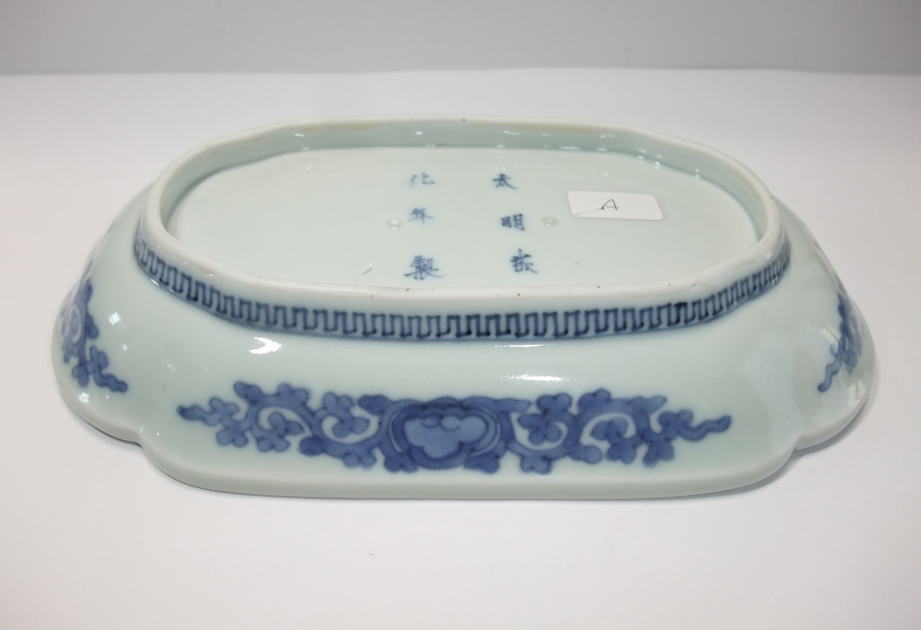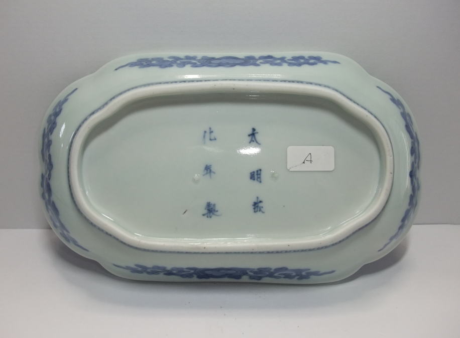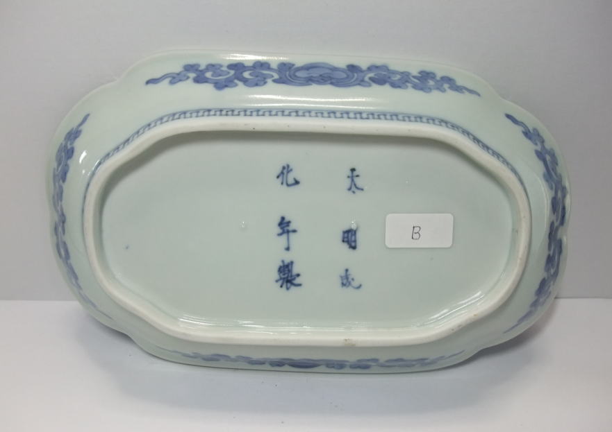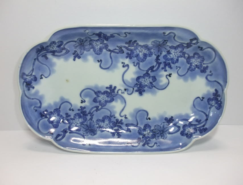 | No.25112004 \ 75,000(1客) \140,000(ペア) 藍柿葡萄文角皿。 元禄。 元禄期藍柿衛門様式の上手作品です。見込みを作らずに中央を左右に白磁にして廻りをダミで囲み上下に葡萄文を描いています。裏の唐草文様も丁寧に描かれ大明成化年製銘でまとめています。器の向きの上下を変えても同じ様に描かれ工夫を凝らしています。通常の長皿作品より大振りに成形されていますので見ていても目立つ作品です。 傷なし2客あります。1客売り、ペア売り、どちらでも可。 21.1cmW×12.8cmL×3.3cmH |