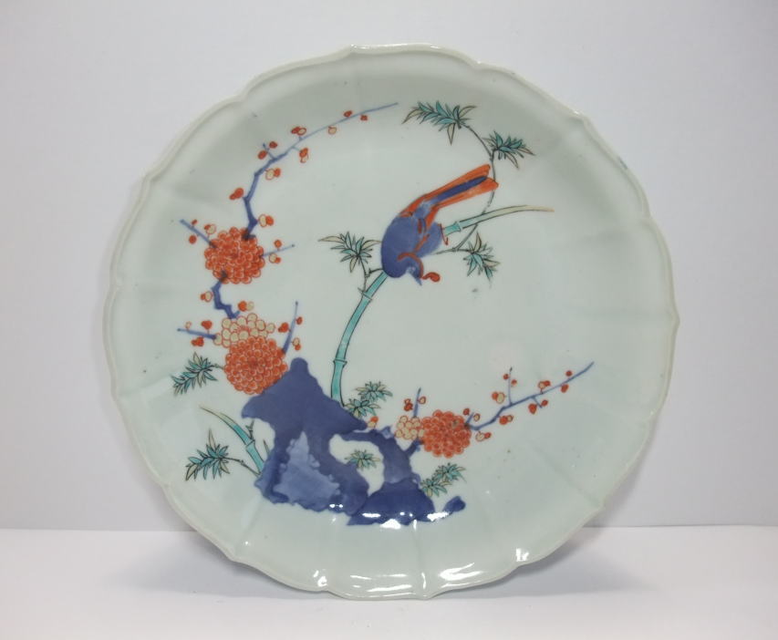 No.25112005 \180,000(1客) 染錦柿右衛門花鳥文6寸皿。 元禄。 元禄期染錦柿右衛門の作品です。下部の岩、梅枝、鳥の胴体に染付を使用して竹、梅花。鳥の尾っぽ等々には赤、緑、黄の釉薬を使用して綺麗に描かれています。裏の唐草文様も最高に綺麗に描かれた上手作品となります。ハレーションも適度に確認出来て良い感じです。中央からやや右部分に小さな釉切れがありますが鑑賞には問題ない程度です。同手の図柄で寸法の大きい作品、裏の唐草の描き方が違う作品と数種類確認されていますが、本作品のタイプが一番上作に制作されています。 傷なし1客あります。 19.3cmW×3.5cmH |